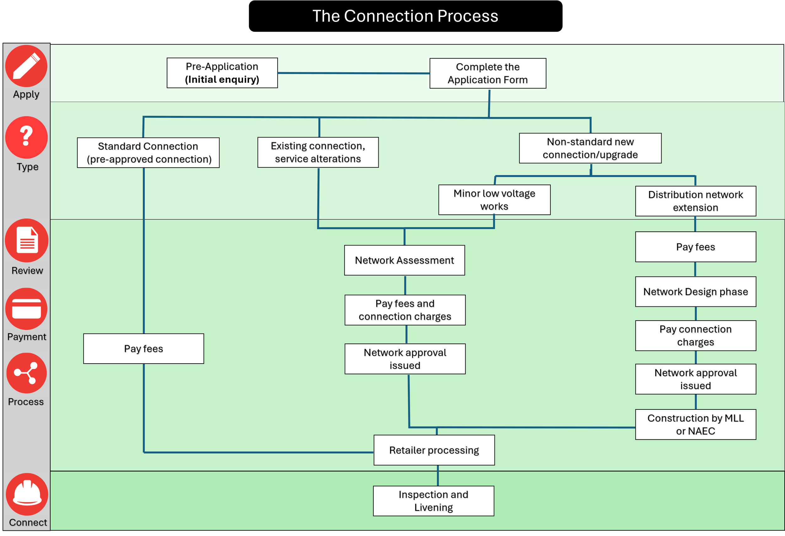 For a Standard connection application, please allow approximately 4–6 weeks from application submission through to livening.