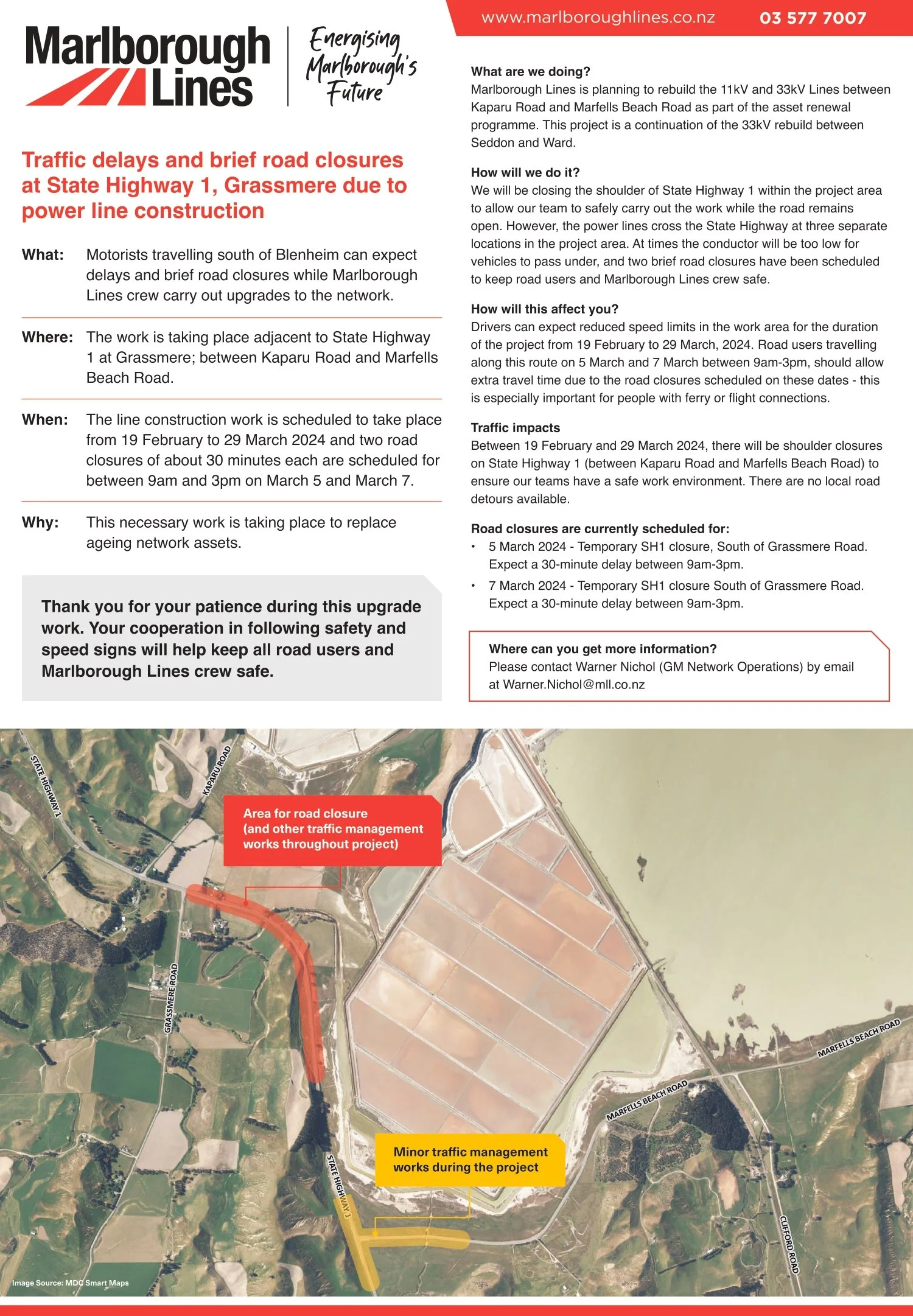 Traffic Delays and Brief Road Closures at State Highway 1, Grassmere due to power line construction 9 Feb Written By Jo Anderson Jo Anderson